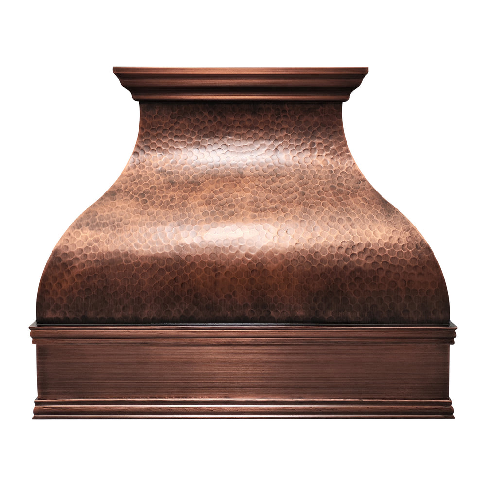 Handcrafted and distinctive, the USA antique copper range hood with artisan design URHC-22 embodies the artistry of custom design with a hammered texture that is richly defined and visually striking.  The handmade custom vent hood was made from 99% pure copper, its natural luster deepens into even more beautiful tones over time, while the material’s fast heat dissipation and easy-to-clean surface ensure lasting practicality. The metal kitchen exhaust hood's smooth, bell-shaped silhouette flows seamlessly from base to crown, enhanced by a fully hammered finish that captures light with depth and movement.  Built to order for ceiling height, finish, and insert fan preferences, this rustic copper range hood blends timeless luxury with functionality, offering a sculptural centerpiece designed to elevate any traditional kitchen.