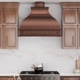 The USA URHC-09 luxurious copper range hood with artisan apron merges classic elegance with distinctive personality, where a flattened bell shape blends seamlessly with geometric lines to create a sculptural, commanding presence. Crafted from antique copper, its warm, unified tone brings depth and sophistication, while the intricately carved apron at the base adds a flourish of ornamental artistry. This custom copper range hood transforms ventilation into visual poetry, balancing functional precision with handcrafted beauty. Each artisan kitchen hood can be tailored in size, finish, and detailing, ensuring a harmonious integration with eclectic, Mediterranean-inspired, or traditional kitchens. Paired with bronze cookware, ceramic vessels, or hand-finished wooden utensils, this metal exhaust hood becomes a statement of enduring style, refining both culinary practice and interior design with quiet grandeur.