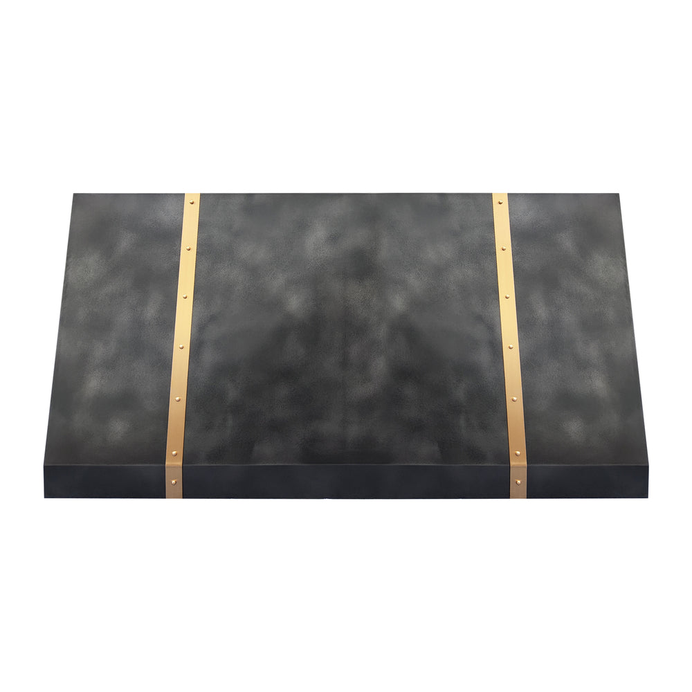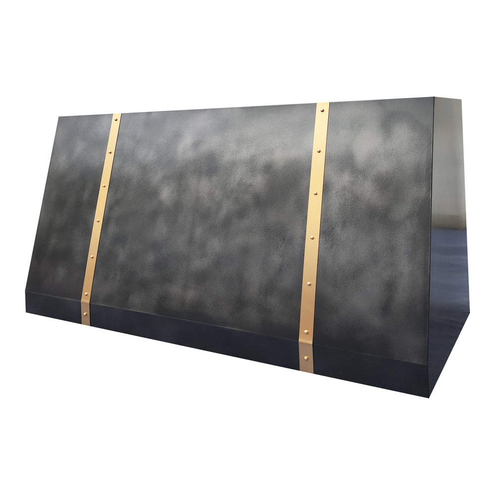 The USA custom zinc range hood with brass straps carries a bold individuality, shaped in a refined curved form that recalls modern geometry while remaining timeless. Its body, forged from zinc with a distinctive textured finish, radiates an industrial yet elegant aura. This modern kitchen vent hood URHZ-01 blends durability with artistry, transforming simple ventilation into sculptural presence. The unique surface matures with subtle character, making the metal vent hood not just a reliable kitchen companion but also a statement of design that complements sleek steel cookware, dark wood accents, or even minimalist ceramic pieces. With its modern rhythm and artisan detail, this zinc artisan exhaust hood stands as both function and ornament in the heart of contemporary living.