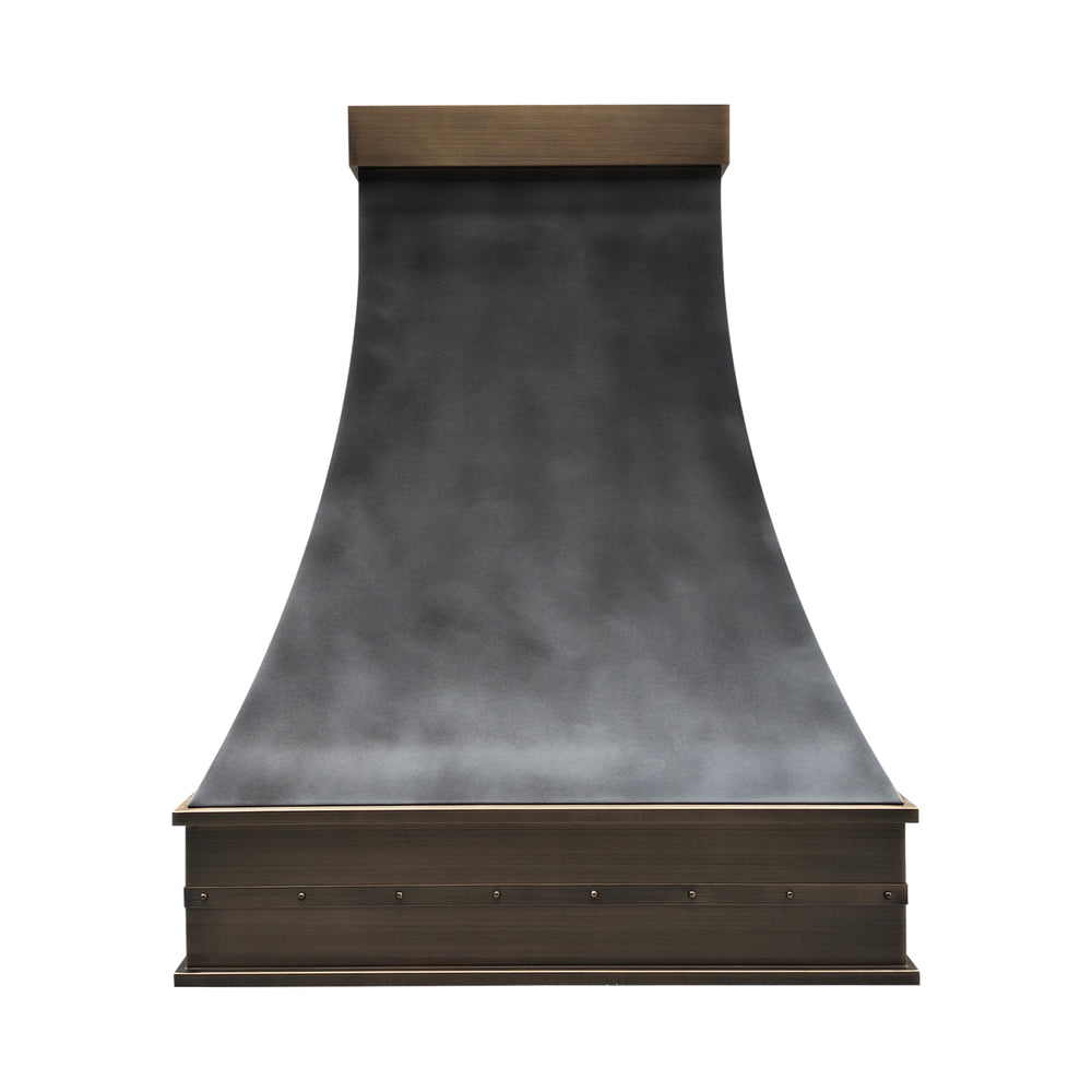 With a gracefully curved silhouette and a smooth dark zinc finish, this custom modern zinc range hood brings understated elegance to kitchens in Brooklyn, New York, where modern design meets vintage charm. Its apron, finished in antique brass and accented with a row of retro rivets and straps, adds a handcrafted detail that pairs beautifully with exposed brick walls, warm wood cabinetry, and open shelving for copper cookware. In these homes, the luxury zinc kitchen hood becomes a focal point that balances clean contemporary lines with nostalgic, tactile accents.