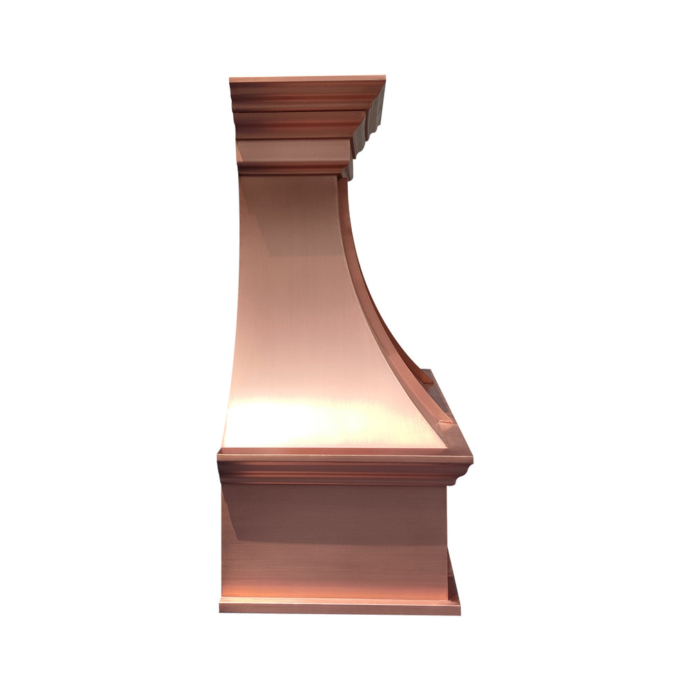 In the heart of the kitchen rises a vision of artistry—this USA luxury copper range hood gleams in its natural copper tone, a silky surface that reflects light with quiet elegance. Handcrafted details crown both the top and base, where intricate carvings recall the grandeur of medieval design, transforming this designer kitchen hood into a masterpiece of classical luxury. The enduring strength of copper, prized for its warmth and resilience, ensures both durability and a patina that grows richer with time. Each metal vent hood balances beauty with function, delivering powerful yet quiet ventilation while serving as a striking focal point. This handcrafted exhaust hood URHC-30 complements European traditional, eclectic artisan, or transitional kitchens, pairing gracefully with cast-iron cookware, brass utensils, or deep wood cabinetry. Every handmade range Hood speaks of permanence and refinement, blending romance and utility in the most essential room of the home.