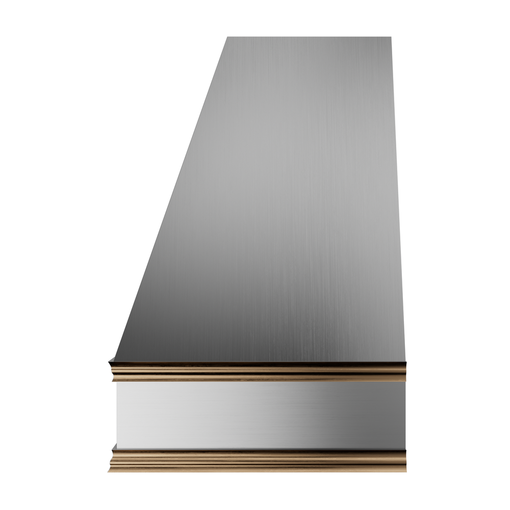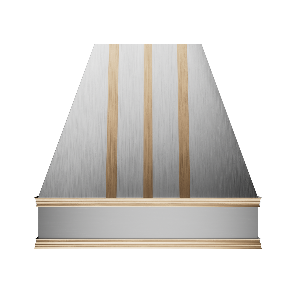 USA URHS-15 minimal stainless steel kitchen vent hood showcases a sleek, tapered silhouette enhanced by striking vertical brass accent strips, creating a modern yet timeless aesthetic. Designed for superior ventilation performance, this custom range hood ensures efficient smoke and odor extraction while making a bold design statement. Fully custom-made with meticulous attention to detail, each piece reflects artistry and sophistication, turning everyday cooking into an elevated experience.This metal kitchen vent hood is ideal for contemporary kitchens, open-concept layouts, or designer spaces seeking both functionality and refined style.