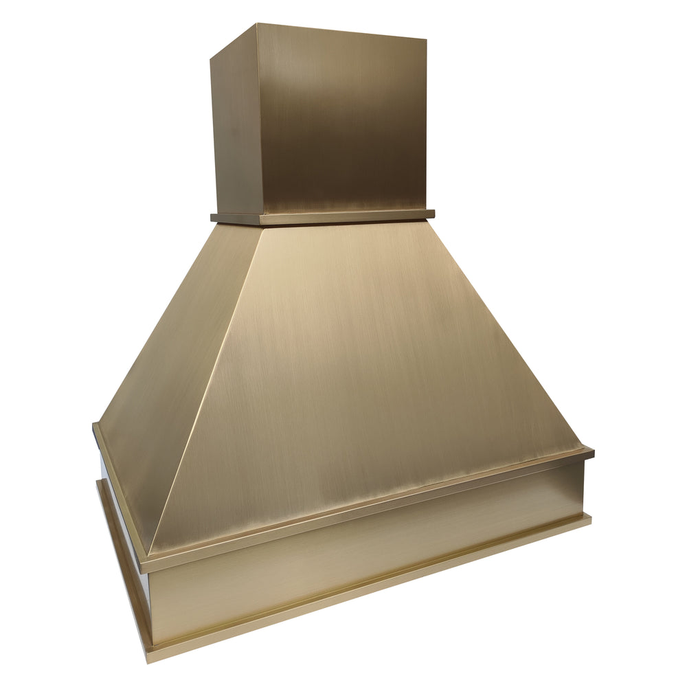 The USA URHB-01 custom brass range hood unfolds as a sculptural presence, its form a balance of geometry with a square crown, a graceful curved center, and a grounded rectangular base. This metal kitchen hood radiates the warm glow of unified brass, allowing the natural metal to speak with timeless clarity. Each classic vent hood is shaped with meticulous attention, becoming both a functional guardian of the air and an artistic statement in the kitchen. Its classic silhouette pairs seamlessly with dark wood cabinetry, ceramic cookware, or even minimalist steel utensils, creating harmony between tradition and modern design. This brass exhaust hood embodies strength, refinement, and individuality, turning every kitchen into a space where design and purpose exist in quiet elegance.