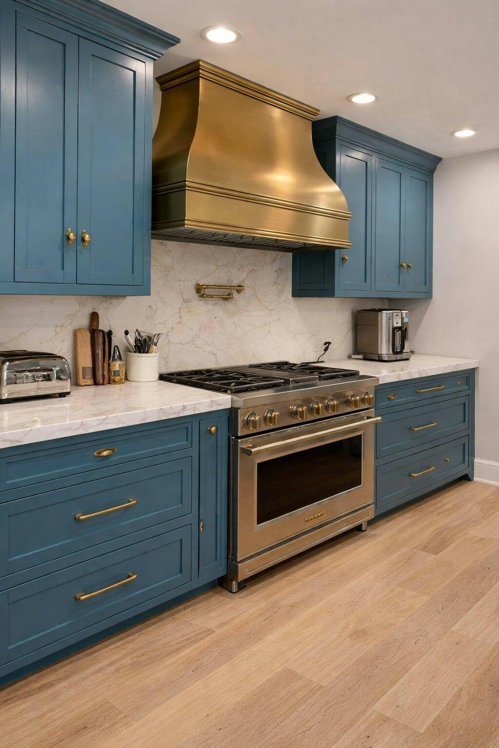 This handmade custom hood feels especially at home in an open-concept kitchen where rich contrasts and timeless textures come together. Picture deep espresso or charcoal-toned cabinets framing the room, their depth balancing the warm glow of brushed brass. Across the island, a stunning blue-and-white marble countertop ripples with natural veining—an unmistakable hallmark of quiet luxury. In this setting, the bell-shaped silhouette anchors the space with an “old money” aesthetic: intentional, polished, and full of depth. The brass surface reflects soft ambient light, creating subtle highlights that move gently across the room.