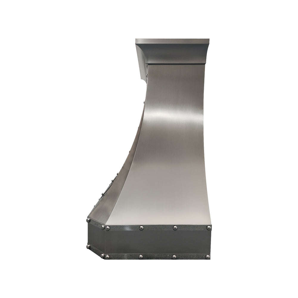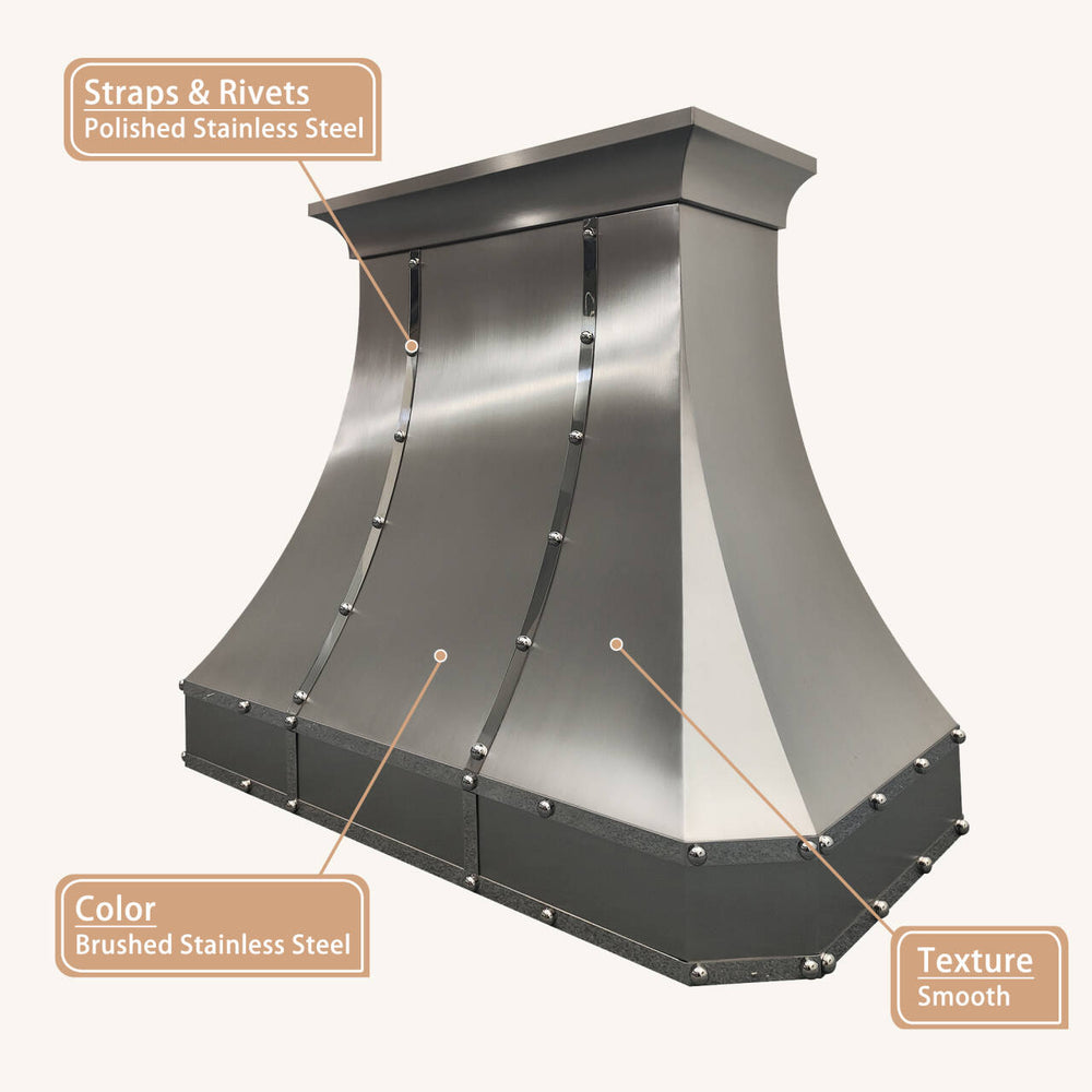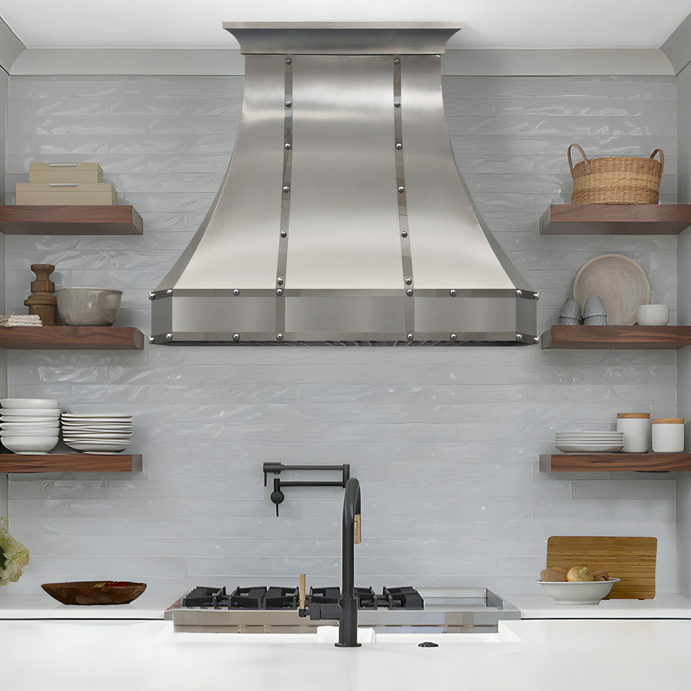 Smooth, sculptural, and quietly confident, this custom stainless steel range hood is designed to bring balance and refinement to the heart of the kitchen. Its curved silhouette softens the space, while polished stainless steel straps and rivets add subtle character—clean, intentional, and never overdone.