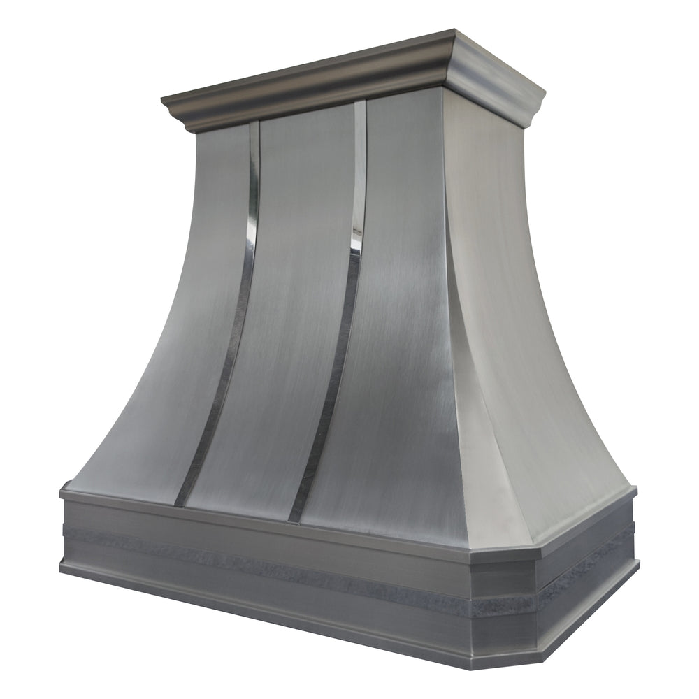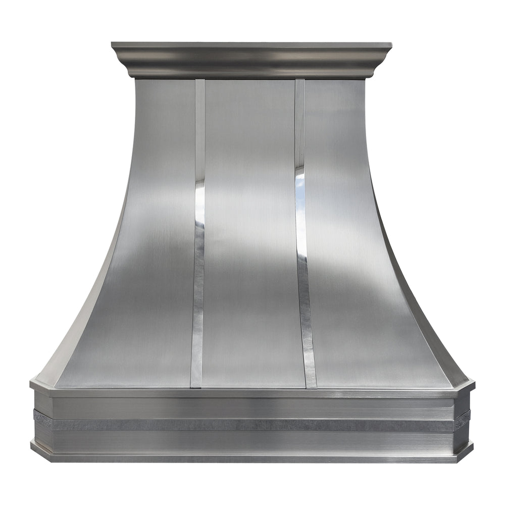 The USA minimal stainless steel kitchen hood embodies modern elegance through its sleek curved and subtly geometric silhouette. Silver metallic bands trace the body with refined precision, catching the light to highlight the understated sophistication of its form. This custom vent hood fuses minimalist design with artisan craftsmanship, offering powerful ventilation wrapped in contemporary style. Each handcrafted metal range hood URHS-04 can be tailored in size, finish, and proportion, ensuring it complements the unique rhythm of your space. Its clean, sculptural presence fits effortlessly into modern minimalist kitchens, urban lofts, or Scandinavian-inspired interiors, pairing seamlessly with stainless steel cookware, matte stoneware, or brushed wood utensils. As a classic vent hood, it becomes both a functional centerpiece and a statement of enduring design, radiating clarity, refinement, and thoughtful artistry.