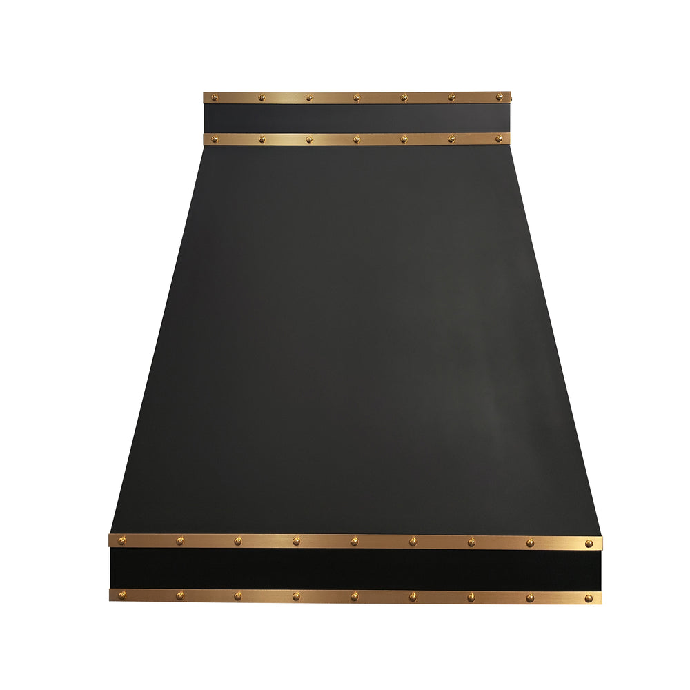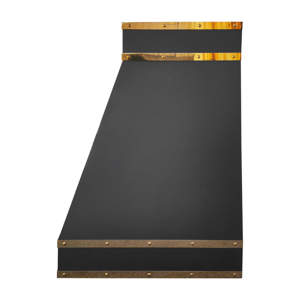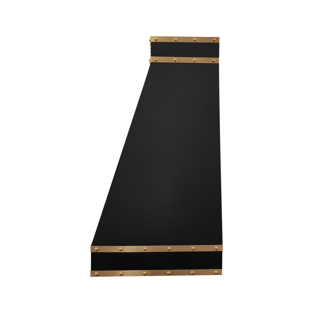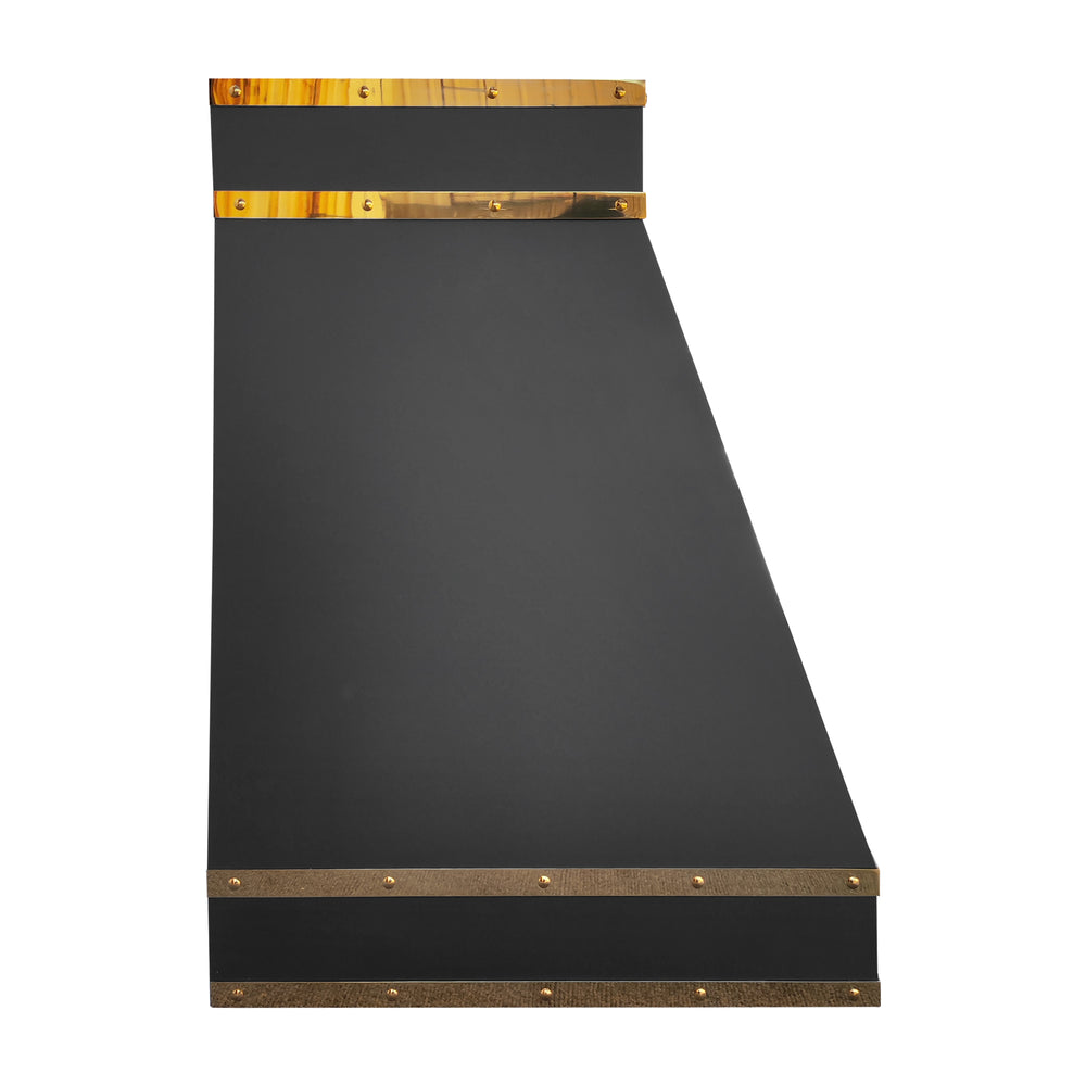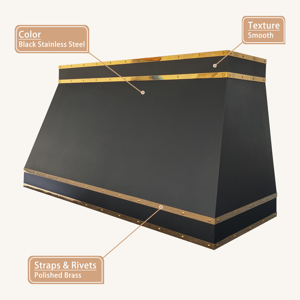 Bold yet understated, the USA modern range hood for modern kitchens transforms culinary spaces into expressions of contemporary elegance. Crafted from black stainless steel, the metal kitchen vent resists heat, fingerprints, and everyday wear, while the golden straps at the top and bottom add a touch of warmth and refined contrast. This sculptural kitchen canopy delivers quiet, high-performance ventilation, making it ideal for home chefs, design-conscious families, or culinary enthusiasts seeking both function and style. Whether suspended above a minimalist island in an open loft, anchoring a gourmet kitchen with dark countertops and industrial appliances, or accenting a sleek professional cooking space, the artisan ventilation hood URHS-39 harmonizes seamlessly with its surroundings. Not just a utilitarian fixture, the handcrafted custom vent hood embodies durability, artistry, and precision—a centerpiece designed for those who value enduring beauty and performance.