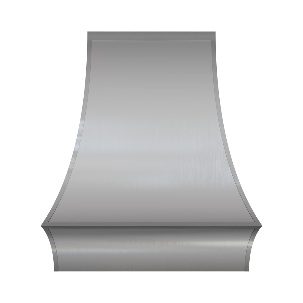Defined by graceful geometry and a calm architectural presence, this modern custom stainless steel hood is shaped like a refined vessel—its silhouette composed of balanced forms that feel sculptural, almost like a modern vase resting at the heart of the kitchen. Finished in smooth brushed stainless steel, the surface reflects light softly, keeping the space bright, open, and effortlessly polished.