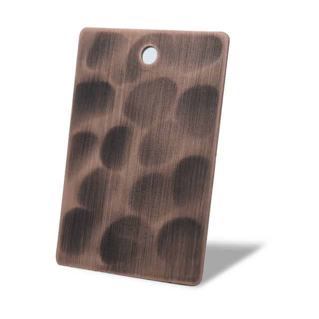 Antique copper samples with a soft hammered finish reveal a surface alive with subtle texture, where gentle indentations catch the light in warm tones of amber and chestnut. Each piece reflects the artistry of handcraft, balancing rugged charm with refined elegance. Built to withstand stains, scratches, and daily wear, this finish offers both enduring durability and timeless character—an inspired choice for kitchens that value beauty shaped by tradition.