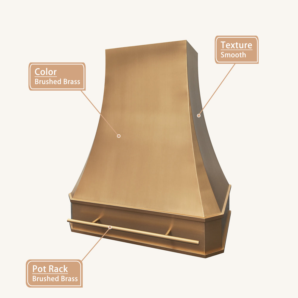 With its gracefully sweeping form and warm brushed-brass finish, the USA custom curved range hood offers more than ventilation—it offers a vision. Designed for the modern kitchen, this metal vent hood combines fluid curves with refined minimalism, where every line serves both beauty and purpose. The integrated lower handle provides a subtle yet striking accent, embodying functionality without disrupting its elegant silhouette. Crafted entirely in solid brass, the non-porous surface resists moisture, heat, and stains, developing a soft patina over time that tells the story of your home. The brushed finish diffuses light gently, adding warmth to your space without reflection or glare. Ideal above an island or against a backdrop of clean cabinetry, this curved modern range hood URHB-03 delivers powerful airflow while standing as a singular piece of functional art. For those who believe a kitchen should breathe as beautifully as it cooks, this is more than an appliance—it’s your next statement.
